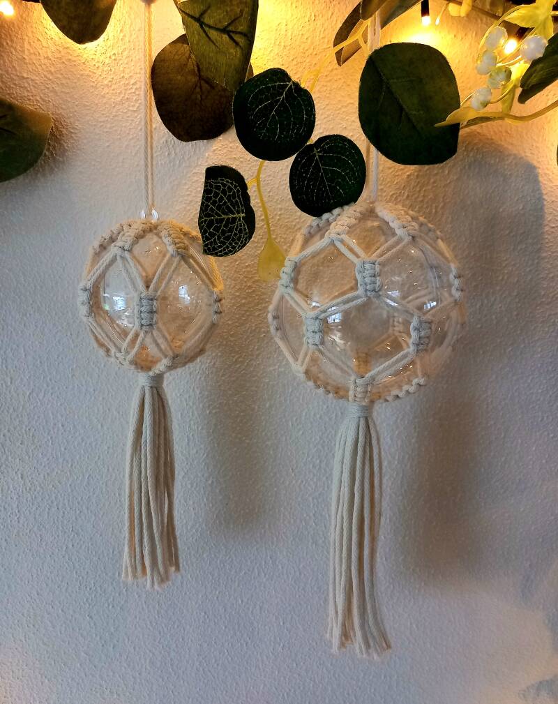 Met dit DIY-pakket leer je via een tutorial, stap voor stap hoe je zelf 2 kerstballen kunt macramé-en.