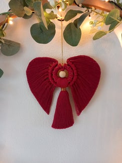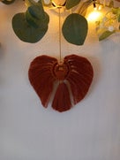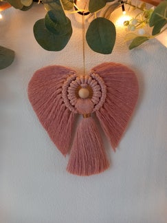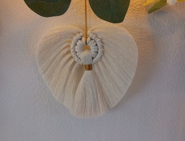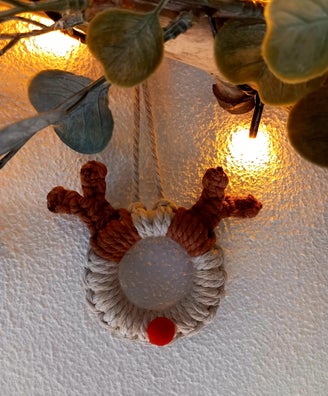 Gemaakt op een houten ring met ecru en bruin koord. En een rode neus.